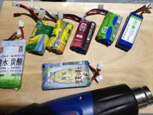 バッテリパックのラッピング実験。ペットボトルから外したラッピングは切り取り線を上にし、切り取り線側から収縮させるとちぎれにくいように感じた。逆向きに作業を始めた緑色の「おーい、お茶」は収縮時にあっさり裂けたが、これだけ裂けていてもしっかり…
