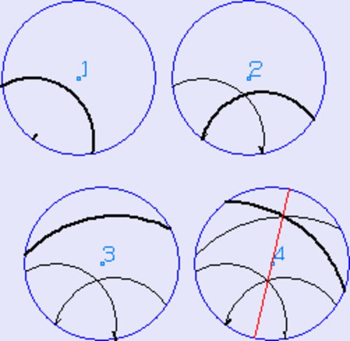 中心位置が分からない既成の円盤を工作に使う際に、そのセンターを調べるには文房具のコンパスを使うと良い。 1と2,3と4がそれぞれ同じ半径を使っている。 1と2は円盤の半径より小さな半径、3と4は大きな半径にしている。 それぞれの円弧の交点を結…