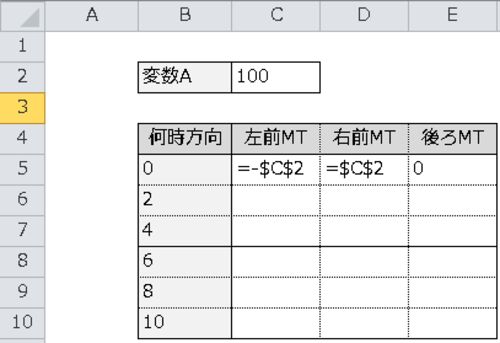 モーター制御値の組み合わせは表計算ソフトなどでまとめると、その周期性に簡単に気づけると思う。全モーターの回転方向を揃えているとより分かりやすい。(以下、Excelの例。数式表示にしています) 3輪:6方向、4輪:8方向をより細かく分ける場合、隣…