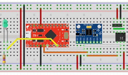 ジャイロセンサのヨー角を電圧で出力できてもパッと見には何も変化がないので、動作確認用も兼ねてセンター(0度)付近の向きが分かるようにLEDを追加する。LEDに接続する抵抗は適当なものを選択する。 setup()の前にLEDを接続するピン番号の定義を追記。ピ…