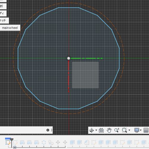 最初のスケッチでは、オムニホイールの外形46mmとメインホイールの外形を記載する。 データ量削減などを期待し、3D出力するパーツで円は使わずポリゴンを使う。 メインホイールは半径21mm、16角。 (以後のポリゴンは説明ない場合は外接ポリゴンを使用) サ…