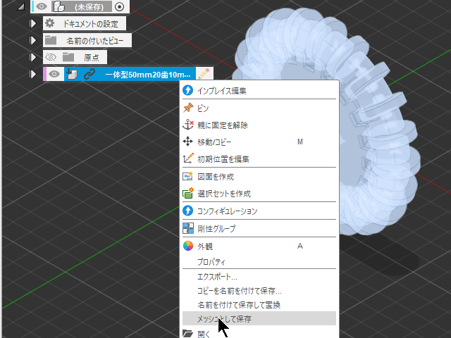 ドラッグ&ドロップしたデータがコンポーネントとして作成されるので、それを「メッシュとして保存」し、STL化する。
